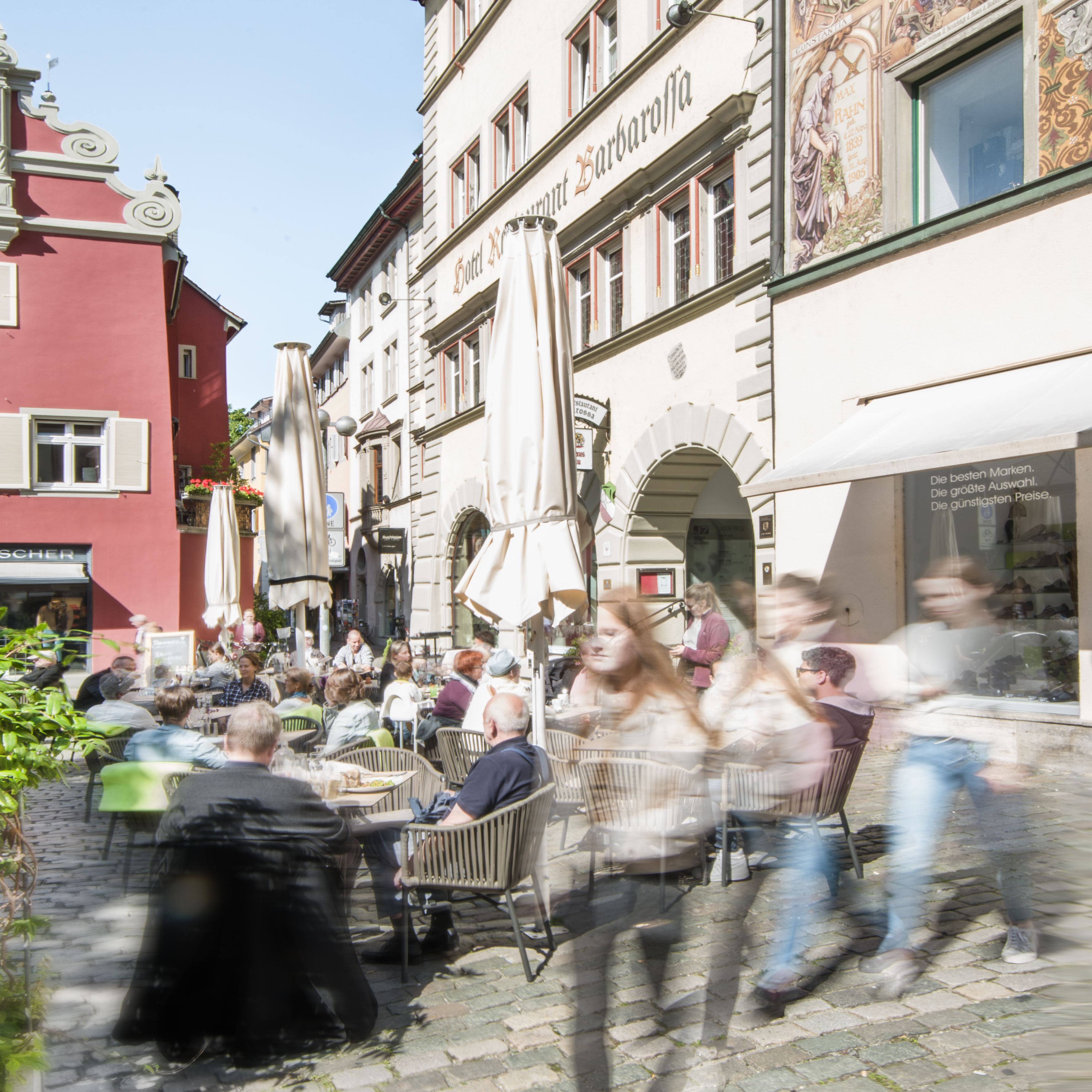 Die große Terrasse auf dem Obermarkt verbindet die wunderschöne Altstadt mit dem Barbarossa. Der Obermarkt war ursprünglich ein wichtiger Umschlagplatz für Waren aller Art. Im Mittelalter wurden hier nicht nur Holz und Wein gehandelt sondern auch Strafen für Gesetzesbrüche verhängt und vollstreckt. Heutzutage möchten wir Sie einladen einen warmen Sommertag, vielleicht mit einem Glas lokalen Weines, ausklingen zu lassen.